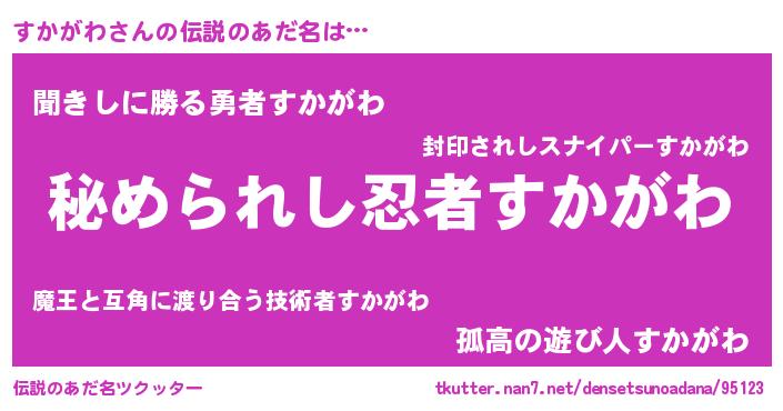 | ヒーロー風カッコイイあだ名 | 『ウルトラすかがわマン』『ネオスカガワ』 |