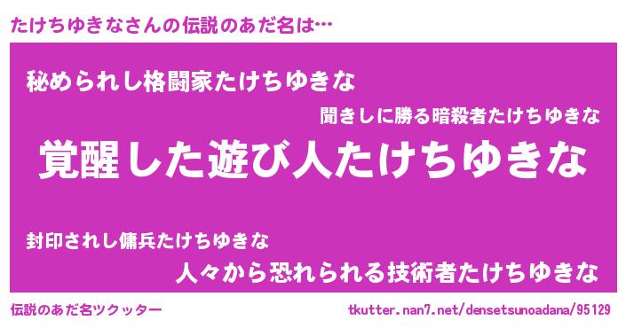 | 男性向けラノベタイトル風あだ名 | 『たけちゆきな~年齢イコール彼女いない歴の魔法使い~』 |