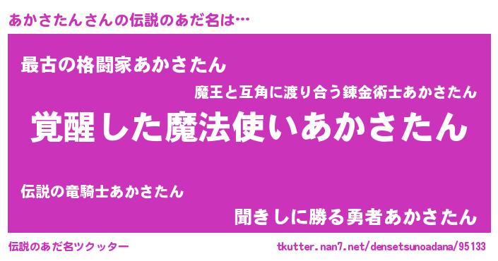 | 男性向けラノベタイトル風あだ名 | 『あかさたんの嫁は女の子じゃないと思った?』 |