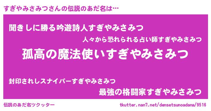 | 男性向けラノベタイトル風あだ名 | 『スギヤミサミツスレイヤー』 |