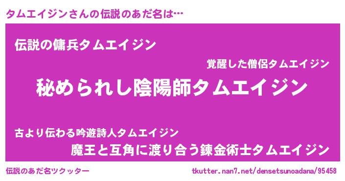 | 男性向けラノベタイトル風あだ名 | 『やはりタムエイジンの青春ラブコメはまちがっている 』 |