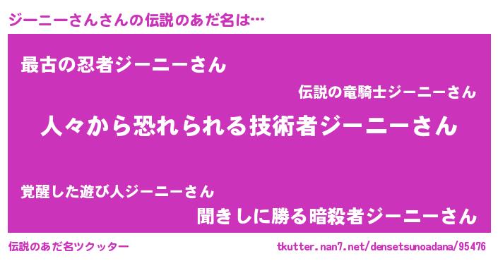 | 男性向けラノベタイトル風あだ名 | 『ジーニーサンスレイヤー』 |