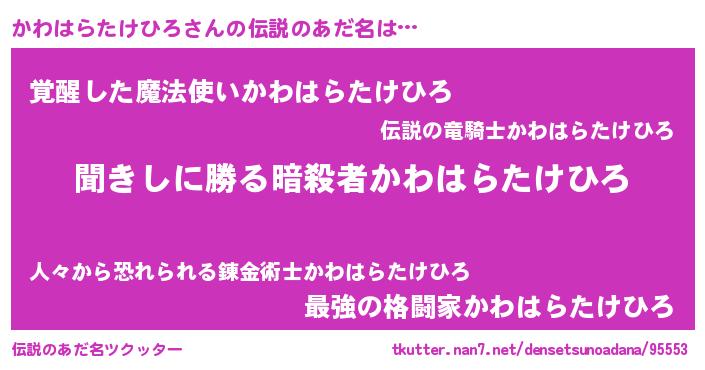 | 男性向けラノベタイトル風あだ名 | 『カワハラタケヒロスレイヤー』 |