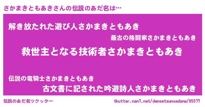 | 男性向けラノベタイトル風あだ名 | 『この素晴らしい世界にさかまきともあきを!』 |