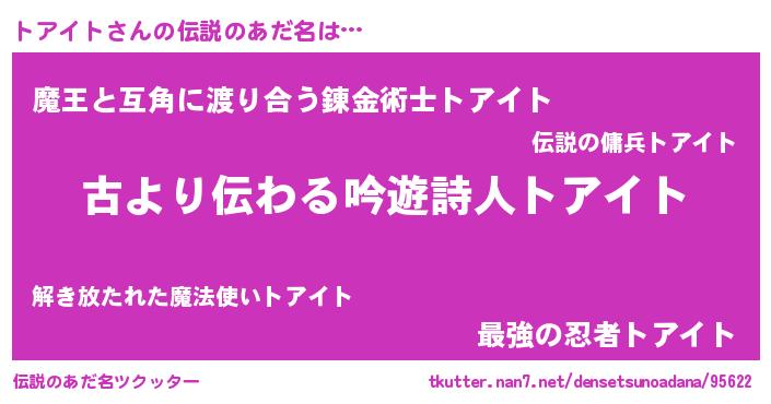 | 男性向けラノベタイトル風あだ名 | 『トアイトという概念が存在しない退屈な世界 』 |