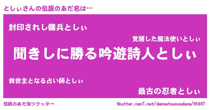| 男性向けラノベタイトル風あだ名 | 『緋弾のトシィ』『はたらくとしぃさま!』 |
