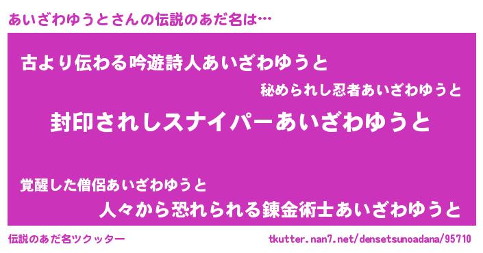 | 胡散臭い通販商品みたいなあだ名 | 『億万長者になれる霊験あらたかなお札…その名も「あいざわゆうと」』 |