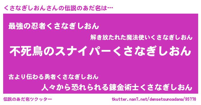 | 胡散臭い通販商品みたいなあだ名 | 『モテモテ間違いなし霊験あらたかなお札…その名も「くさなぎしおん」』 |