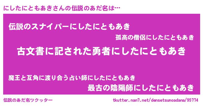 | ヘコむあだ名 | 『にしたにともあき(遠い目)』『にしもー』 |