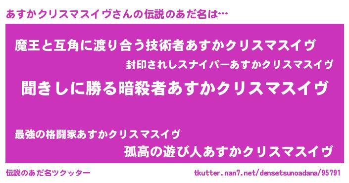 | 女子向けラノベタイトル風あだ名 | 『異世界で失敗しない100のあすかクリスマスイヴ』 |