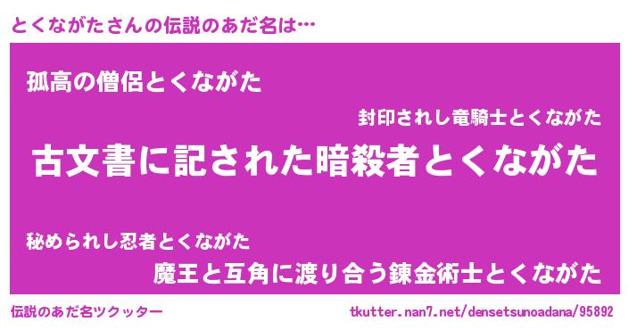 | 男性向けラノベタイトル風あだ名 | 『とくながたに滅ぼされるだけの簡単なお仕事です』 |