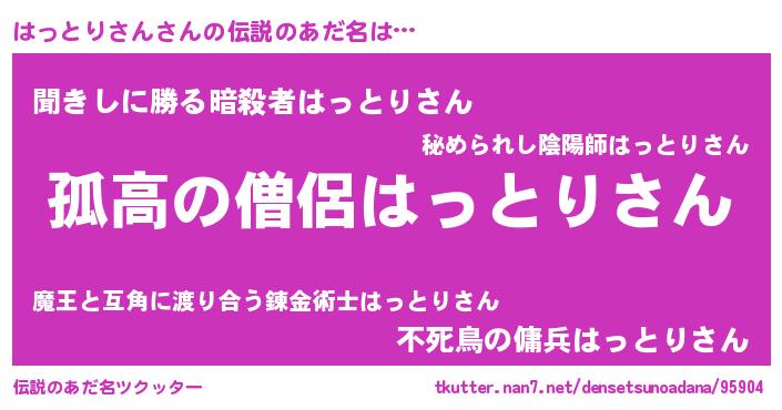 | 男性向けラノベタイトル風あだ名 | 『ダンジョンにはっとりさんを求めるのは間違っているだろうか』 |