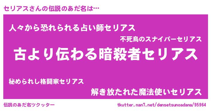 | ヒーロー風カッコイイあだ名 | 『ネオセリアス』『正義の使者セリアス』 |