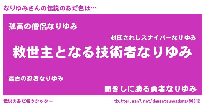 | ヒーロー風カッコイイあだ名 | 『慈愛の使者なりゆみ』『暗黒騎士ナリ』 |