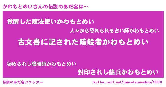 | 男性向けラノベタイトル風あだ名 | 『この素晴らしい世界にかわもとめいを!』 |