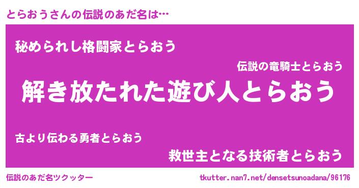 | 女子向けラノベタイトル風あだ名 | 『とらおうの卵を拾いまして』 |