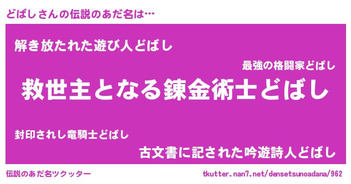 | 男性向けラノベタイトル風あだ名 | 『どばしに滅ぼされるだけの簡単なお仕事です』 |