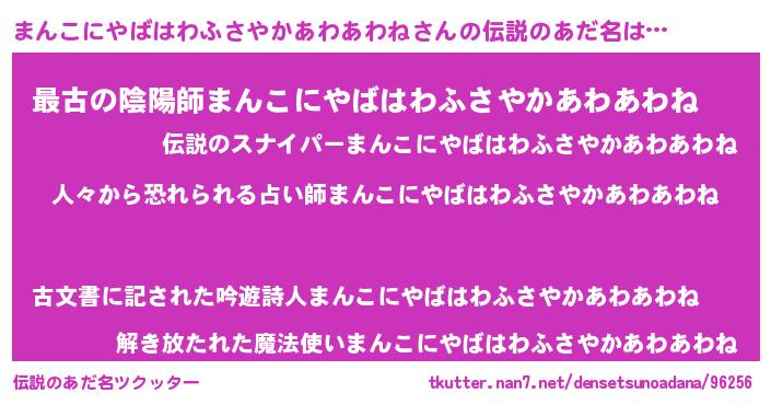 | ヒーロー風カッコイイあだ名 | 『正義の使者まんこにやばはわふさやかあわあわね』 |