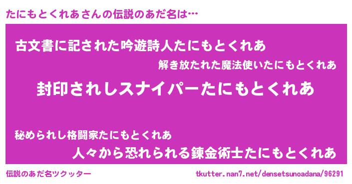 | 意味不明あだ名 | 『自称たにもとくれあ』 |
