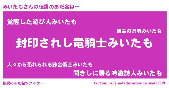 | 男性向けラノベタイトル風あだ名 | 『ミイタモアートオンライン』 |