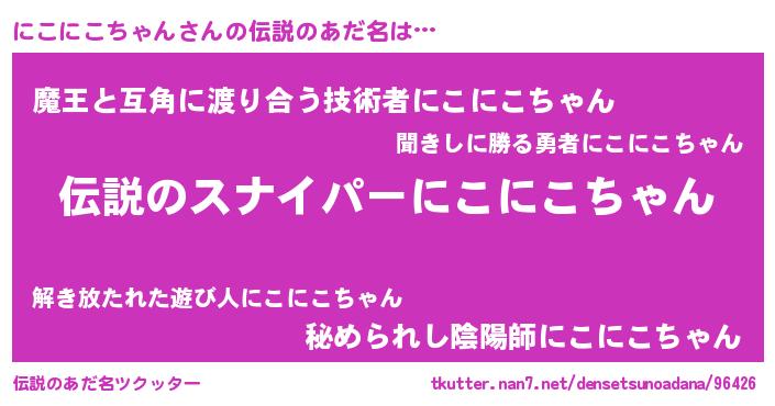 | 男性向けラノベタイトル風あだ名 | 『魔弾の王とにこにこちゃん』 |