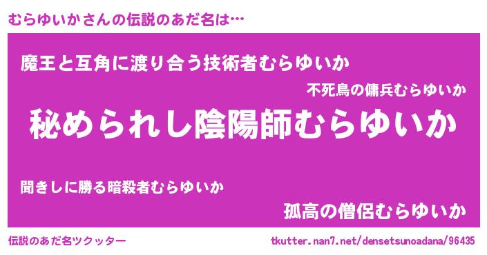 | 男性向けラノベタイトル風あだ名 | 『やはりむらゆいかの青春ラブコメはまちがっている 』 |
