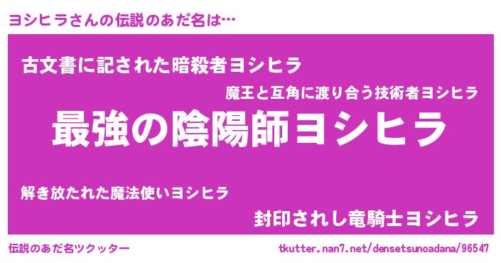 | 男性向けラノベタイトル風あだ名 | 『ヨシヒラ~年齢イコール彼女いない歴の魔法使い~』 |