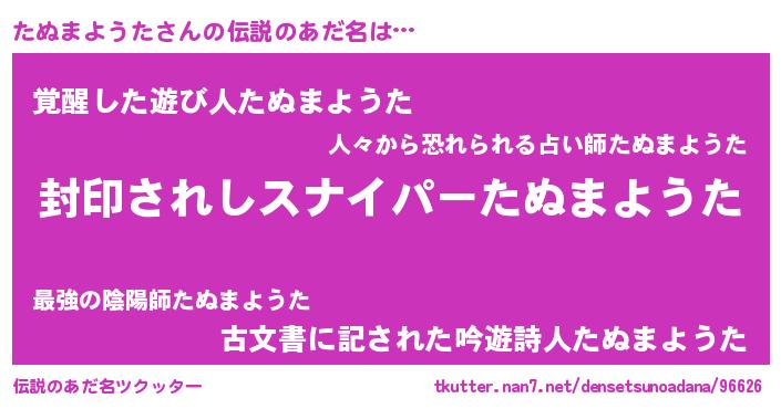 | ヒーロー風カッコイイあだ名 | 『最強戦士タヌマヨウタ』『天弓騎士タヌ』 |