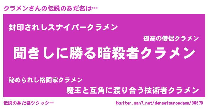 | ヒーロー風カッコイイあだ名 | 『超時空戦士クラメン』『ネオクラメン』 |