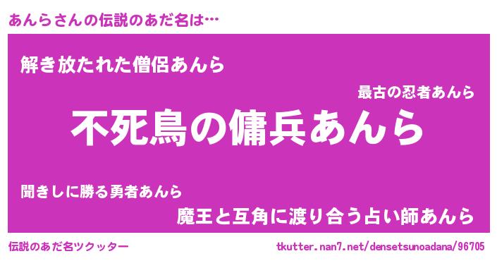 | 男性向けラノベタイトル風あだ名 | 『あんらに滅ぼされるだけの簡単なお仕事です』 |
