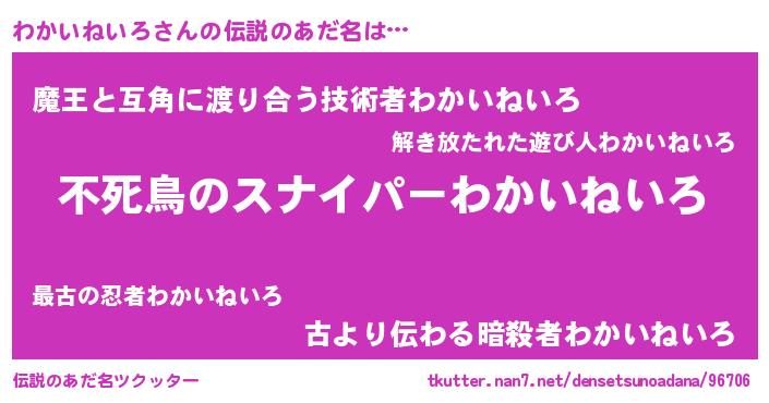 | ヒーロー風カッコイイあだ名 | 『仮面ワカダー』『スーパーワカイネイロ』 |