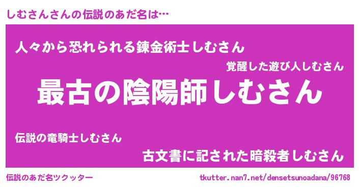 | 男性向けラノベタイトル風あだ名 | 『しむさんに滅ぼされるだけの簡単なお仕事です』 |