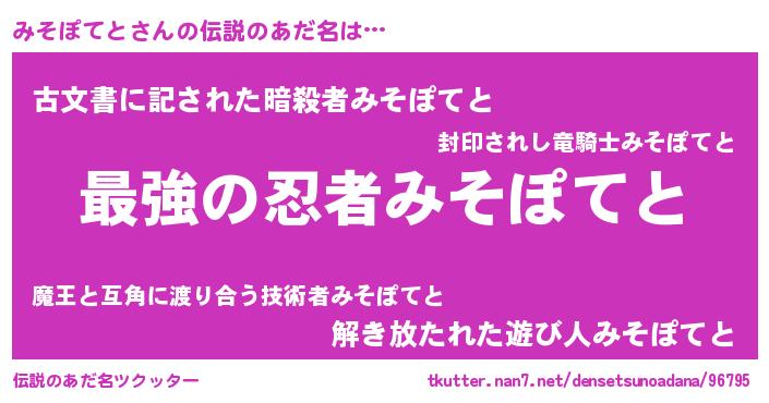 | 意味不明あだ名 | 『住所不定無職みそぽてと(68歳)』 |