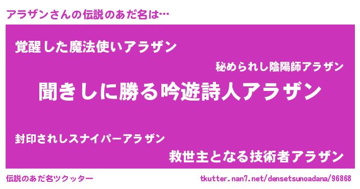 | 意味不明あだ名 | 『住所不定無職アラザン(12歳)』 |