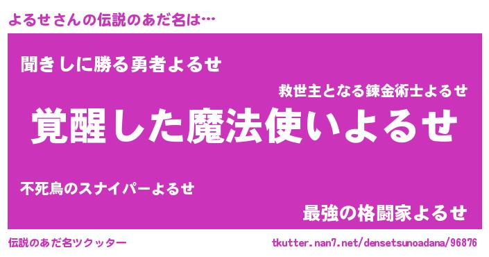 | ヒーロー風カッコイイあだ名 | 『天弓騎士ヨル』『ネオヨルセ』 |