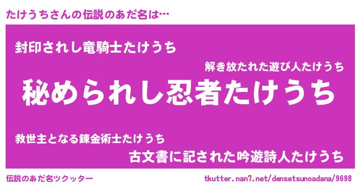 | 男性向けラノベタイトル風あだ名 | 『タケウチスレイヤー』『たけうちの憂鬱』 |