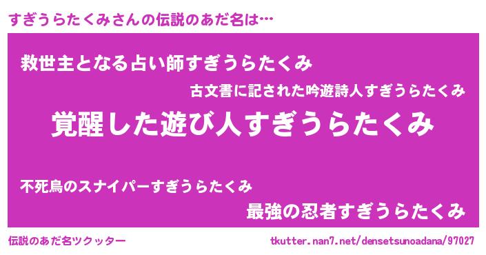 | ポケモン風あだ名 | 『スーギイ』『ヒスギウラタクミ』 |