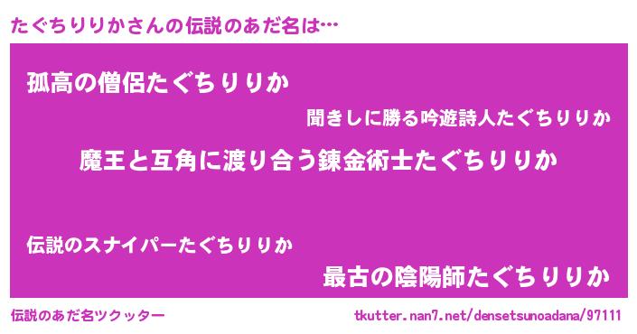 | 女子向けラノベタイトル風あだ名 | 『たぐちりりか恋絵巻』 |