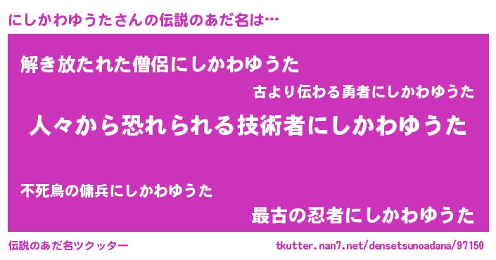| ポケモン風あだ名 | 『ニックウザ』『ヒニシカワユウタ』 |