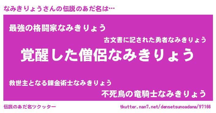 | 男性向けラノベタイトル風あだ名 | 『なみきりょうに滅ぼされるだけの簡単なお仕事です』 |