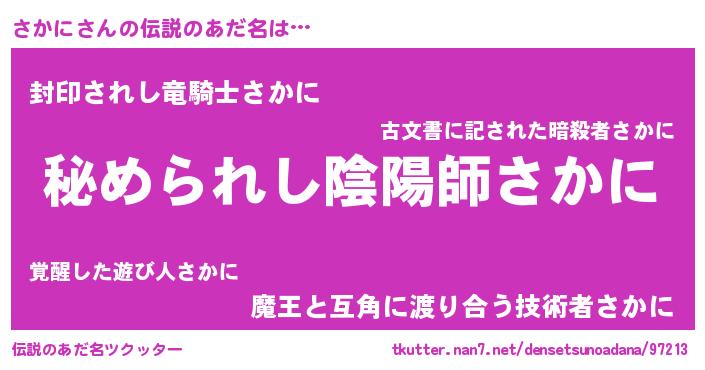 | 女子向けラノベタイトル風あだ名 | 『さかにの雑貨屋さん』『さかに恋絵巻』 |
