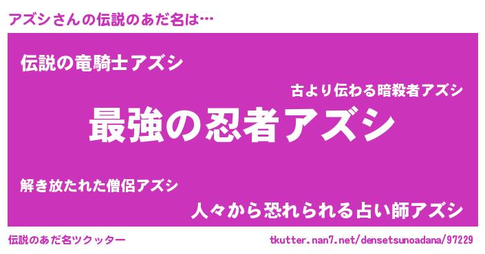 | 男性向けラノベタイトル風あだ名 | 『アズシ~年齢イコール彼女いない歴の魔法使い~』 |