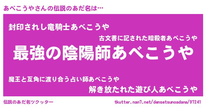 | 男性向けラノベタイトル風あだ名 | 『あべこうや~年齢イコール彼女いない歴の魔法使い~』 |