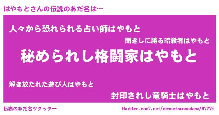 | 男性向けラノベタイトル風あだ名 | 『魔弾の王とはやもと』 |