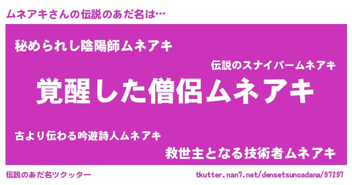 | ヒーロー風カッコイイあだ名 | 『炎刃騎士ムネ』『超時空戦士ムネアキ』 |