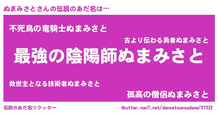 | 男性向けラノベタイトル風あだ名 | 『ぬまみさと~年齢イコール彼女いない歴の魔法使い~』 |