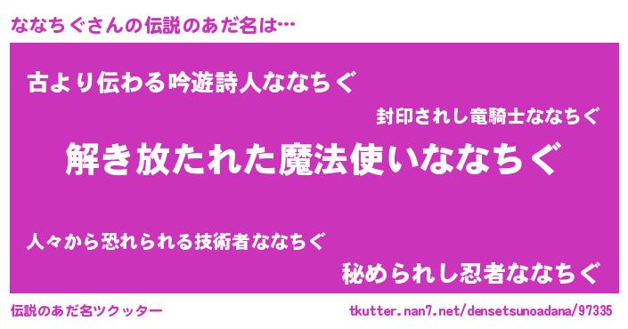 | ヒーロー風カッコイイあだ名 | 『魔戒騎士ナナ』『究極戦士ナナチグ』 |