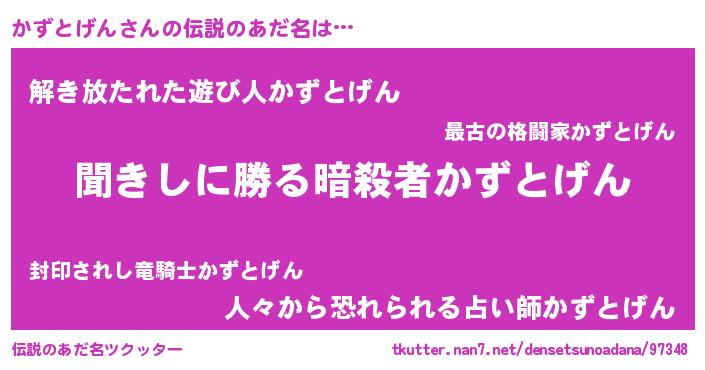 | 男性向けラノベタイトル風あだ名 | 『魔弾の王とかずとげん』 |