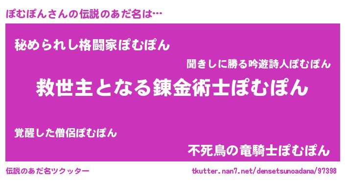 | 男性向けラノベタイトル風あだ名 | 『Re:ぽむぽんから始める異世界生活』 |