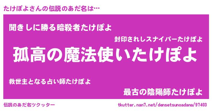 | 男性向けラノベタイトル風あだ名 | 『魔弾の王とたけぽよ』 |